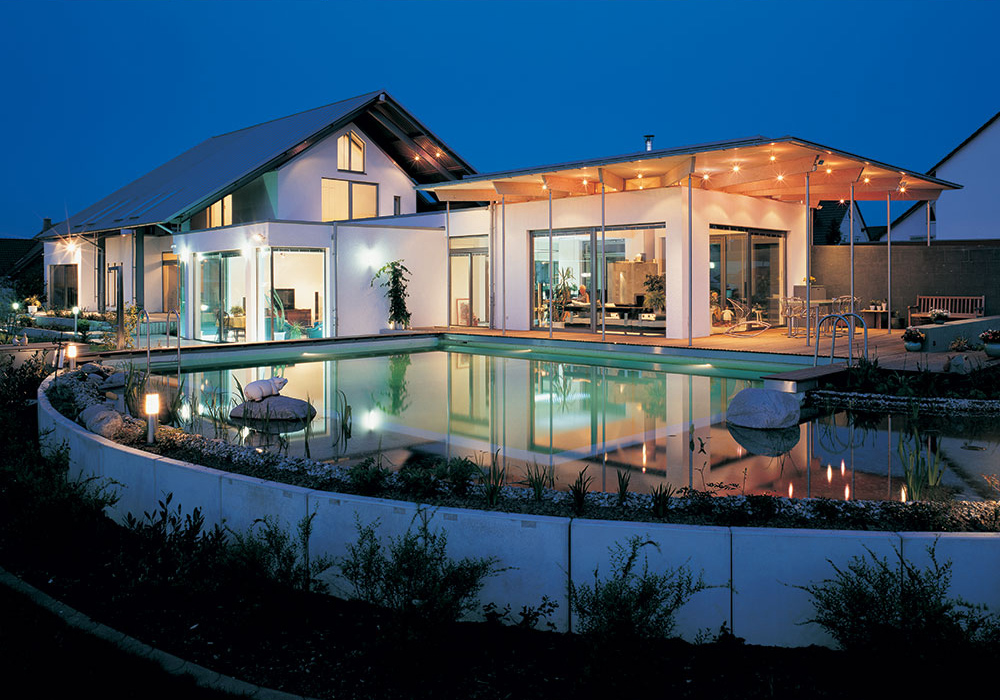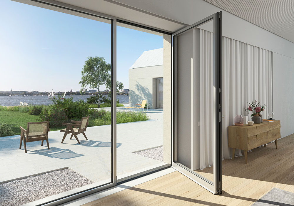 Nulová bariéra, vysoká tepelná izolácia a úzka pohľadová šírka je výhodou dizajnovej možnosti terasových dverí Schüco AWS 90.SI+.